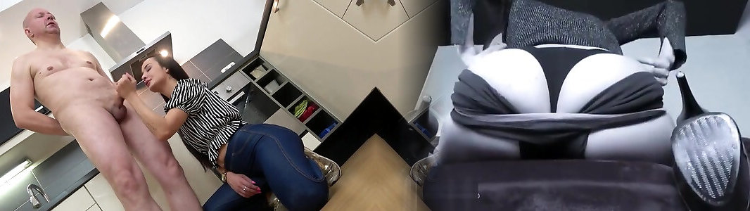 Wild dark-haired nubile globs on her knees to gargle an aged man